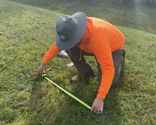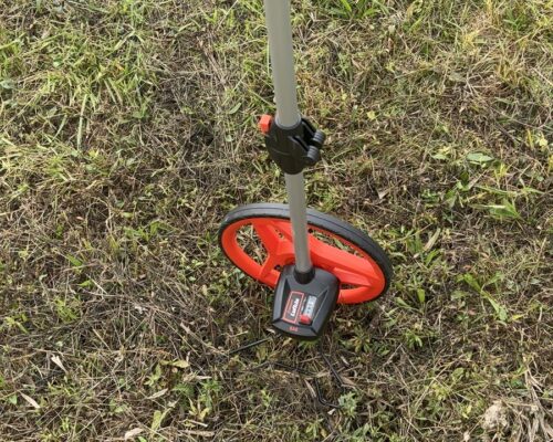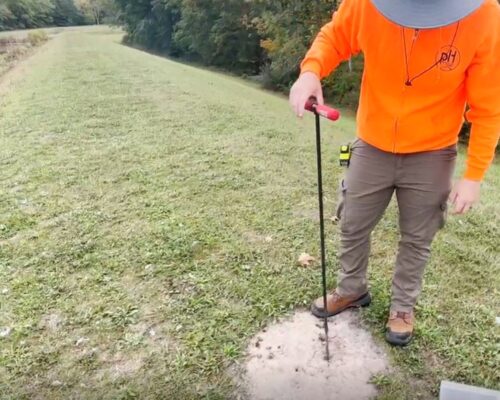 Each tool plays a specific role. The tape measure is used for small-scale assessments, such as measuring cracks or depressions. The measuring wheel helps determine distances between notable features onsite. The tile probe allows Casey to gauge the density and consistency of embankment soils and to investigate for voids in concrete structures. It also comes in handy for checking the depth of animal burrows or the extent of subsurface voids within the dam.