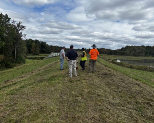To begin the inspection, Casey walks the full length of the embankment, conducting a detailed visual assessment. He looks for telltale warning signs: animal burrows, seepage, erosion, settlement, slope instability, and woody vegetation that could damage the dam face or block visibility during future inspections. One of the most common and problematic issues he encounters is overgrown vegetation, which can significantly hinder the ability to properly evaluate the structure. Keeping the dam clear is critical for spotting early warning signs and maintaining long-term safety.