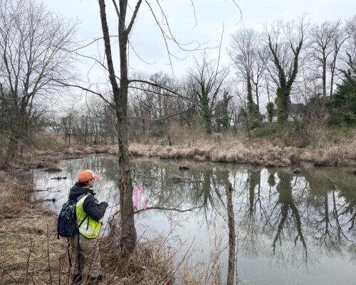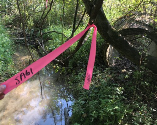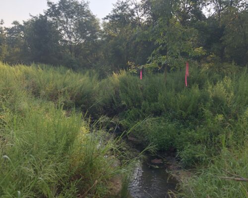 Ivy and Emily must also delineate waterbodies concurrent with wetlands. Waterbodies may include, but are not limited to, streams, rivers, lakes, and ponds. To delineate a waterbody, they hang labeled flagging along the waterbody’s top of bank or its ordinary high water mark. Throughout this process, they take pictures to document the existing waterbody conditions.