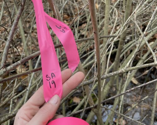 Once they locate the boundary, they flag the wetland line, labeling the flagging with the wetland nomenclature and either hanging it or pinning it into the ground.