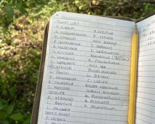 Ivy and Emily begin by locating known (mapped) wetland or waterbody features and writing a list of all plants observed on-site. They maintain the plant list throughout the day.