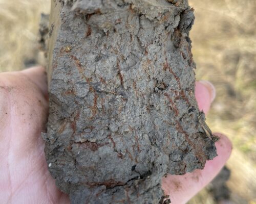 Ivy and Emily’s soil boring assessment showed that the soils within the top 12 inches of the soil surface were saturated (primary) and bright orange streaks were visible along the plant roots, which they documented as oxidized rhizospheres along living roots (primary). Because they identified more than one primary and two secondary wetland indicators, they can confidently delineate the wetland.