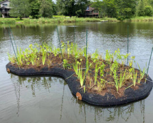 To reduce nutrient availability in lakes, one innovative tool in our toolbox is floating wetland islands (FWIs). FWIs are a low-cost, effective green infrastructure solution that are designed to mimic natural wetlands in a sustainable, efficient, and powerful way. They improve water quality by assimilating and removing excess nutrients; provide valuable ecological habitat for a variety of beneficial species; help mitigate wave and wind erosion impacts; provide an aesthetic element; and add significant biodiversity enhancement within open freshwater environments. FWIs are also highly effective in a range of waterbodies from big to small, from deep to shallow.
