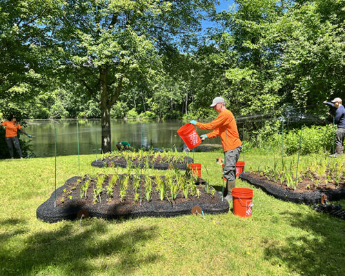 Working with the Deal Lake Commission (DLC), Princeton Hydro designed and installed 12 floating wetland islands at two lakes in Asbury Park, NJ. In order to complete the installation of the floating wetland islands, our team worked with the DLC to train and assist over 30 volunteers to plant plugs in the islands and launch them into the two lakes. Our experts helped disseminate knowledge to the volunteers, not only about how to install the floating wetland islands, but how they scientifically worked to remove excess nutrients from the water. With assistance from Princeton Hydro, DLC acquired the 12 floating islands – six for Wesley Lake and six for Sunset Lake – through a Clean Water Act Section 319(h) grant awarded by NJDEP.
