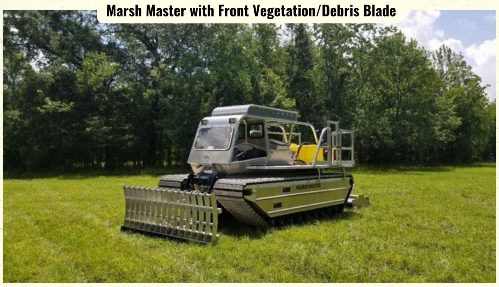 Equipped with hydraulic rotary cutting blades, a rear mounted roller/chopper attachment, and a front vegetation plow, the Marsh Master® cuts through dense vegetation like Phragmites, then chops and rolls the stalks, effectively preparing the soil for native seed germination or plug installation, making it ideal for nature preserves, canal banks, and restoration sites. Its light footprint (less than one pound per square inch) means it can traverse sensitive areas without damaging the soil or root layer.