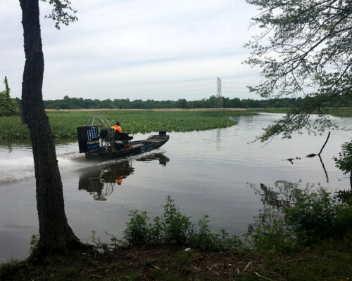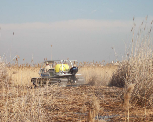 Princeton Hydro conducted a Floristic Quality Assessment to identify invasive areas and to establish a baseline for the restoration efforts. The team also performed hydrologic monitoring to understand tidal stage elevations. From 2018-2019, herbicide treatments were consistently conducted to combat the invasive phragmites. In the winter of 2019-2020, 46 acres of phragmites was cut and rolled with our Marsh Master using a modified steel roller attachment. The phragmites was then removed by raking, which in turn exposed the marsh plain’s substrate and seedbank to promote germination of the native marsh vegetation. Extensive areas of wild rice, mud plantain, broad leaved cattail, water purslane, pickerelweed, and arrow arum colonized the areas formerly overtaken by phragmites within the first growing season after the marsh plain was exposed. The project also includes the creation of 500 linear feet of living shoreline, a freshwater mussel bed, and a sustainable boat launch.