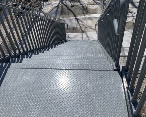 The image below shows the old stairway, laboratory building, and island space with a white outline depicting the project area: